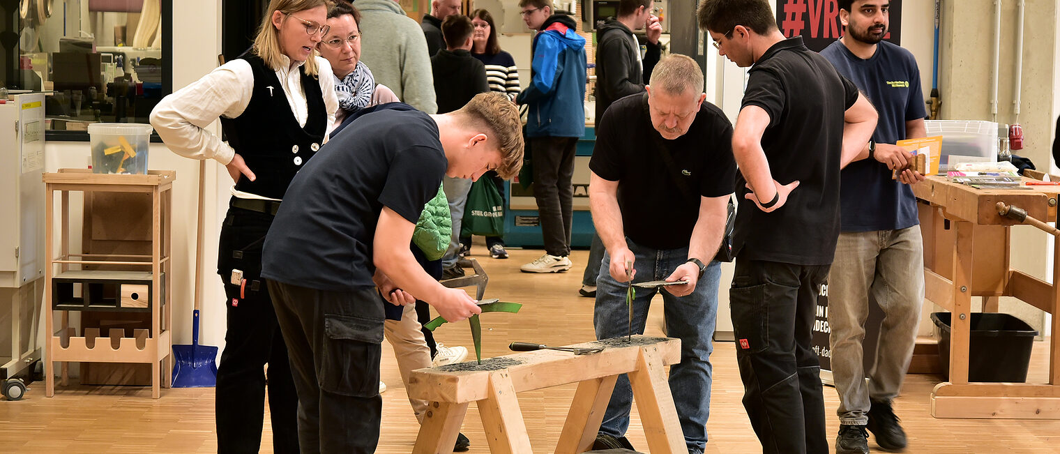 Ausbildungsmeisterinnen und -meister luden die Jugendlichen in die Werkstätten ein, sich selbst handwerklich auszuprobieren – ein Angebot, das sehr gerne angenommen wurde. Ob im Schweißsimulator, beim virtuellen Lackieren oder im Bau-Simulator am Radlader: Überall konnten die jungen Besucherinnen und Besucher ihre Talente testen. Eine Rallye durchs Haus führte die Jugendlichen auf spielerische Weise durch die verschiedenen Werkstätten, wo sie Fragen beantworten und spannende Einblicke ins Handwerk gewinnen konnten.